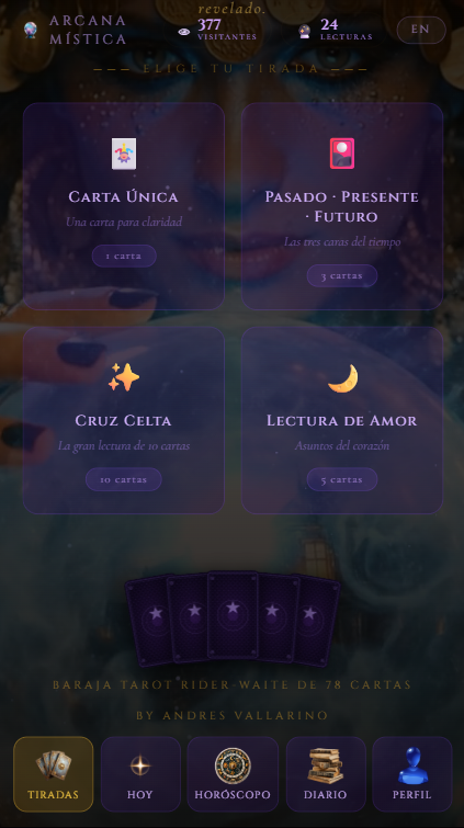 App de lectura de Tarot con arquitectura multi-agente de IA en producción. Construida con React + Vite, orquesta un pipeline de agentes especializados con LangGraph StateGraph, genera interpretaciones con Groq (Llama 3.3) y tiene observabilidad completa via LangSmith. Incluye memoria de perfil persistente, diario de lecturas, carta diaria, horóscopo semanal y lecturas personalizadas por fecha de nacimiento. Deployada con Serverless Functions en Vercel.