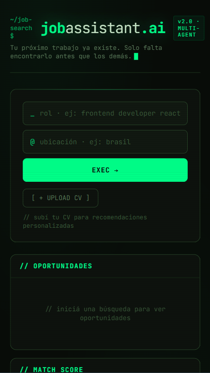Asistente de búsqueda laboral con arquitectura multi-agente y LLM tool calling real. 3 agentes especializados (Scraper, Analyzer, CV Optimizer) coordinados por un orquestador LangGraph con memoria persistente y retry logic. CV Optimizer con RAG real (FAISS + Embeddings). Datos reales via Adzuna API.